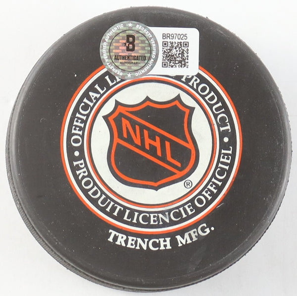Toronto Maple Leafs Logo Hockey Puck. Hand-signed and inscribed by Johnny Bower (D. 2017, HOF).The autograph includes an official Beckett Authentication Services serially numbered hologram and QR Code card for authenticity purposes.Authentication: Beckett Hologram with QR Code card