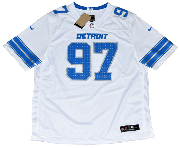 Aidan Hutchinson, All-Pro defensive end for the Detroit Lions, has hand signed this white Nike replica jersey at a private signing. Jersey is new/unworn and all letters/numbers are screen print. This item is authenticated by Beckett Authentication Services, one of the best authenticators in the industry. Their tamper-evident hologram featuring a QR code and serial number is on the item. The authenticity can be verified online by entering the serial number or scanning the QR code.Item pictured may not be the exact item you will receive. It will be similar quality, and we guarantee your satisfaction.