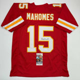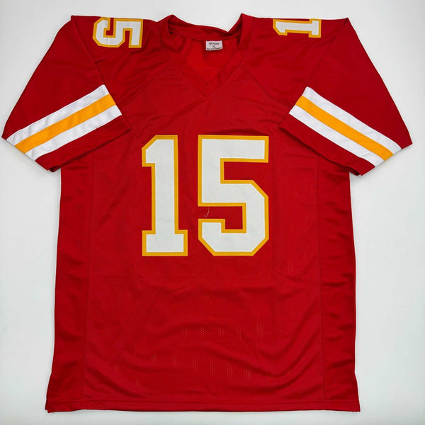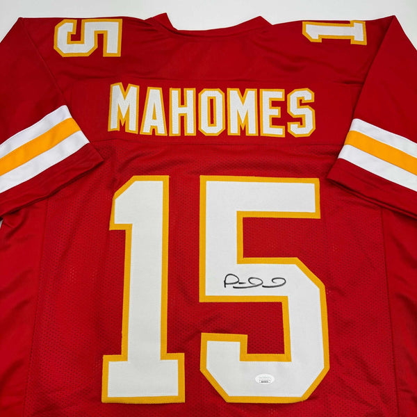Autographed/Signed Patrick Mahomes Kansas City Red Football Jersey JSA COA Jersey has no brand names or logos. This is a custom jersey and was not manufactured by or in any manner associated with any professional sports league or manufacturer. This custom jersey carries no professional sports league designation. The item is intended to be an autographed collectible. The custom jersey displays the name and number of the player. This item in no way is affiliated with or connected to any professional sports organization. Size is XL