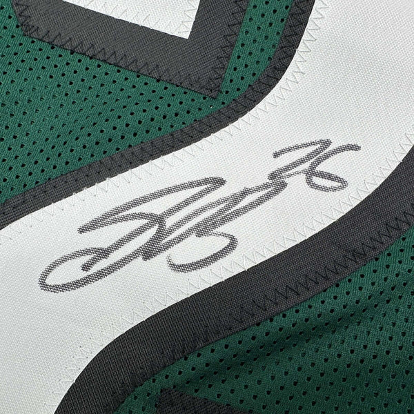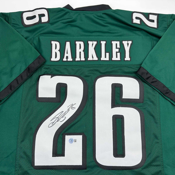 Autographed/Signed Saquon Barkley Philadelphia Midnight Green Jersey Beckett COA Jersey has no brand names or logos. This is a custom jersey and was not manufactured by or in any manner associated with any professional sports league or manufacturer. This custom jersey carries no professional sports league designation. The item is intended to be an autographed collectible. The custom jersey displays the name and number of the player. This item in no way is affiliated with or connected to any professional sports organization. Size is XL.