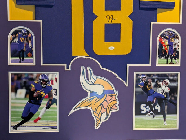 Custom Framed Justin Jefferson hand signed Minnesota Vikings style custom jersey.JSA Hologram and COAThe authentication is from JSA. This signature is authenticated by a representative of JSA! 100% AUTHENTIC!!! The jersey has fully stitched numbers on the front and back. It is a great item and a must for all great sports fans!Stock photos are used for auctions. Will receive equal quality.This item is professionally framed, it measures 32"x40" inside , 42"x34" outside , using UV protective Acrylic glass for safe keeping and safe transport, team color matting, black moulding and hanging hooks on the back. All additional items in frame seen in pictures included. 100% ready to hang in your fan cave.