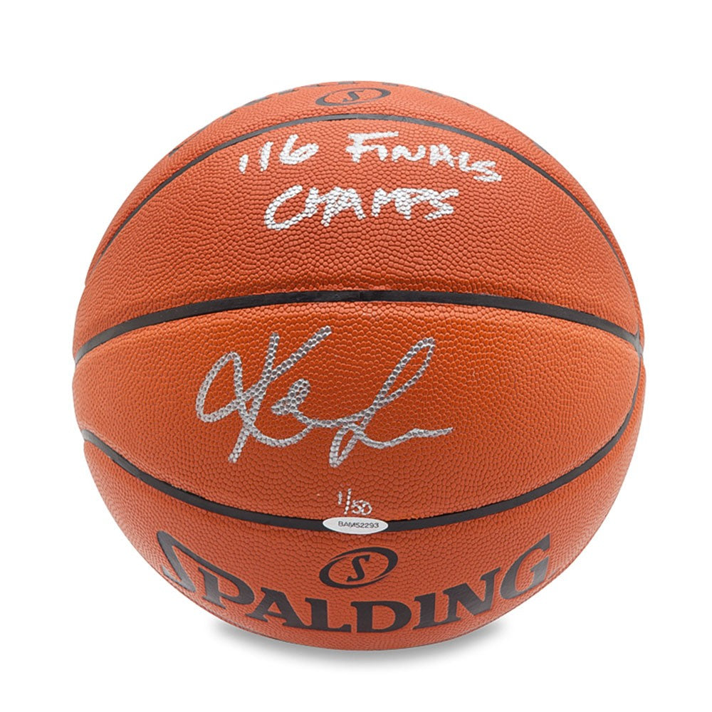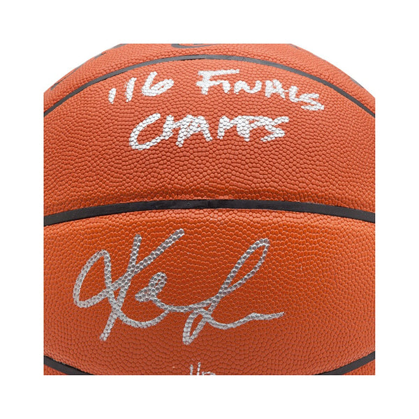 The 2016 NBA Finals was the ultimate roller coaster ride for Cleveland Cavaliers fans and Kevin Love alike. The team went down 3-1 to the defending champion Golden State Warriors before fighting back and wining in one of the most epic seven-game series in Finals history. For Love, it was an up-and-down fortnight as well. He led both teams in rebounding in Game 1 then suffered a head injury while attempting to grab a rebound in Game 2. That kept him out in the second half of the game and put his services for the rest of the series in danger. He fought back and made potentially the defensive play of the season when he forced Stephen Curry into a contested 3-point attempt late in Game 7. The result was a miss and Cleveland went on to clinch the championship. Love led the Cavs with 14 rebounds in Game 7. Love has signed and inscribed " '16 Finals Champs " on this Indoor/Outdoor Spalding basketball in silver paint pen. His signature is deemed authentic by virtue of Upper Deck Authenticated's Five-Step Process.