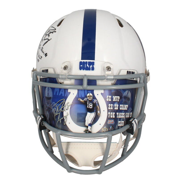 This authentic speed helmet has been personally hand-signed by peyton manning. manning added the following inscriptions: "the sheriff" and "sb xli mvp." it is officially licensed by the national football league and comes with an individually numbered, tamper-evident hologram from fanatics authentic. to ensure authenticity, the hologram can be reviewed online. this process helps to ensure that the product purchased is authentic and eliminates any possibility of duplication or fraud.included with this helmet is a custom visor and 3d bumpers. money back guarantee! if for any reason you are not completely satisfied with the quality or authenticity of your purchase, we will gladly give you a full refund or exchange, whichever you prefer up to 30 days after purchase. please feel free to e-mail us with any questions. good luck bidding!!! authenticator pre-certified authenticator: fanatics authenticated history of item: manning has signed this item in the presence of a representative from fanatics authenticated. describe how you came to possess this item: super sports center is a fully authorized dealer for upper deck authenticated as well as mounted memories and steiner sports. other information about you and / or the item: super sports center strives to deliver the most authentic in sports memorabilia from trusted companies like mounted memories, steiner sports and upper deck authenticated. if it exists, we can find it for you!