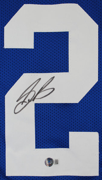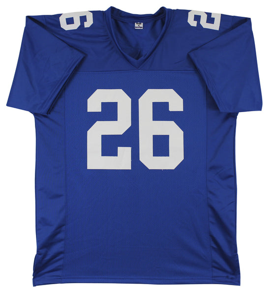 This Autographed Blue Pro Style Jersey has been Personally Signed by Saquon Barkley of the New York Giants. This item is 100% Authentic to include a hologram by Beckett Authentication Services. This item will come with an affixed Beckett Authentication Services (BAS) authentication sticker, which includes a scannable QR code to verify authenticity. Please note that Beckett no longer provides serial-numbered COA cards, and the attached BAS sticker will serve as the complete authentication for this item. This is a BAS Witnessed Protection Program item which means a Beckett Authentication Service representative was present when this item was being signed. We conducted an autograph signing with Saquon Barkley where multiples of the same item were signed. While the photographs are representative of this item, the size, placement and strength of the signature may vary. Each item is hand signed, therefore, each autograph is unique. This item can be verified through BAS Witnessed. This is a X-Large sized, non-branded, custom-stitched Jersey.