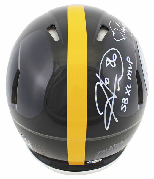 This Autographed Riddell Authentic Full Size Speed Proline Helmet with the inscription of "The Bus (Bettis)" has been Personally Signed by Jerome Bettis, Hines Ward & Troy Polamalu of the Pittsburgh Steelers. This item is 100% Authentic to include a hologram by Beckett Authentication Services. This item will come with an affixed Beckett Authentication Services (BAS) authentication sticker, which includes a scannable QR code to verify authenticity. Please note that Beckett no longer provides serial-numbered COA cards, and the attached BAS sticker will serve as the complete authentication for this item. This is a BAS Witnessed Protection Program item which means a Beckett Authentication Service representative was present when this item was being signed. We conducted an autograph signing with Jerome Bettis, Hines Ward & Troy Polamalu where multiples of the same item were signed. While the photographs are representative of this item, the size, placement and strength of the signature may vary. Each item is hand signed, therefore, each autograph is unique. This item can be verified through BAS Witnessed.