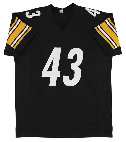 This Autographed Black Pro Style Jersey has been Personally Signed by Troy Polamalu of the Pittsburgh Steelers. This item is 100% Authentic to include a hologram by Beckett Authentication Services. This item will come with the new Beckett Authentication hologram that has a scannable QR code rather than the traditional COA. If you would like to have a COA, you are welcome to reach out to Beckett for a printed certification once you receive your item. This is a BAS Witnessed Protection Program item which means a Beckett Authentication Service representative was present when this item was being signed. This is a stock item. We conducted an autograph signing with Troy Polamalu and we have several of these available. The one you will receive will be of equal quality to the one pictured. This item can be verified through BAS Witnessed. This is a X-Large sized, non-branded, custom-stitched Jersey.