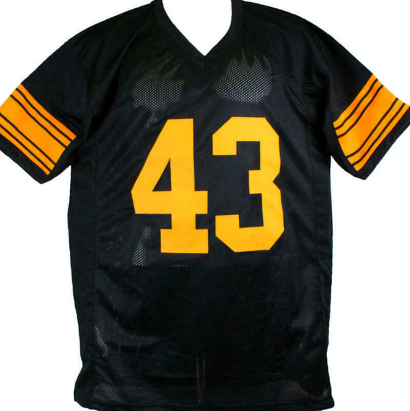 Troy Polamalu Autographed Black/Yellow Pro Style Jersey - Beckett W Hologram *Black THIS IS NOT AN NFL JERSEY. THIS HAS NO TAGS, NO LOGOS, NO EMBLEMS. This is a hand autographed Jersey of Troy Polamalu. This is a Custom Made (non name brand) Authentic Style (stitched letters and numbers) Jersey. This item has a Beckett Witnessed Authentication, which comes with a numbered sticker hologram and a generic Beckett Certificate of Authenticity. You can view this item on the Beckett Authentication website. It was signed either at a public autograph appearance or a private signing. This is a stock photo of the item. Although you may not receive this exact item, the item you receive is virtually identical and brand new in great shape. Jersey size is XL.