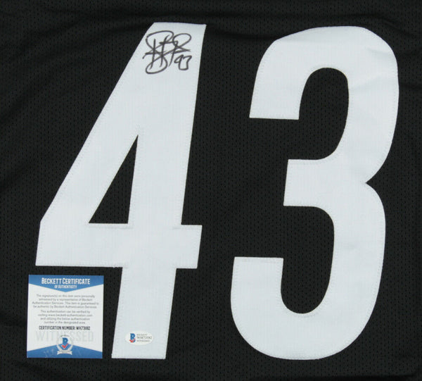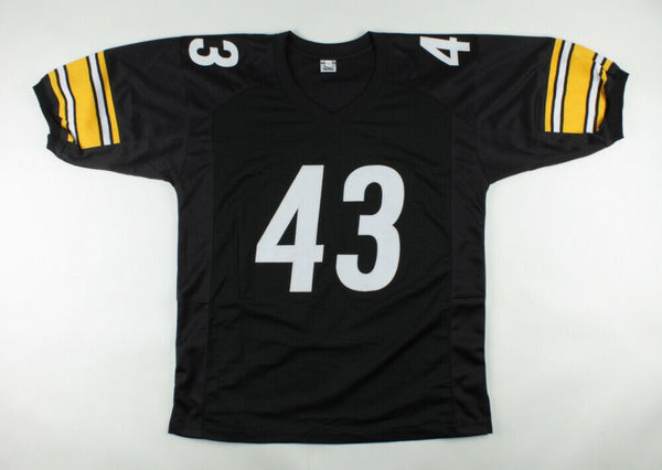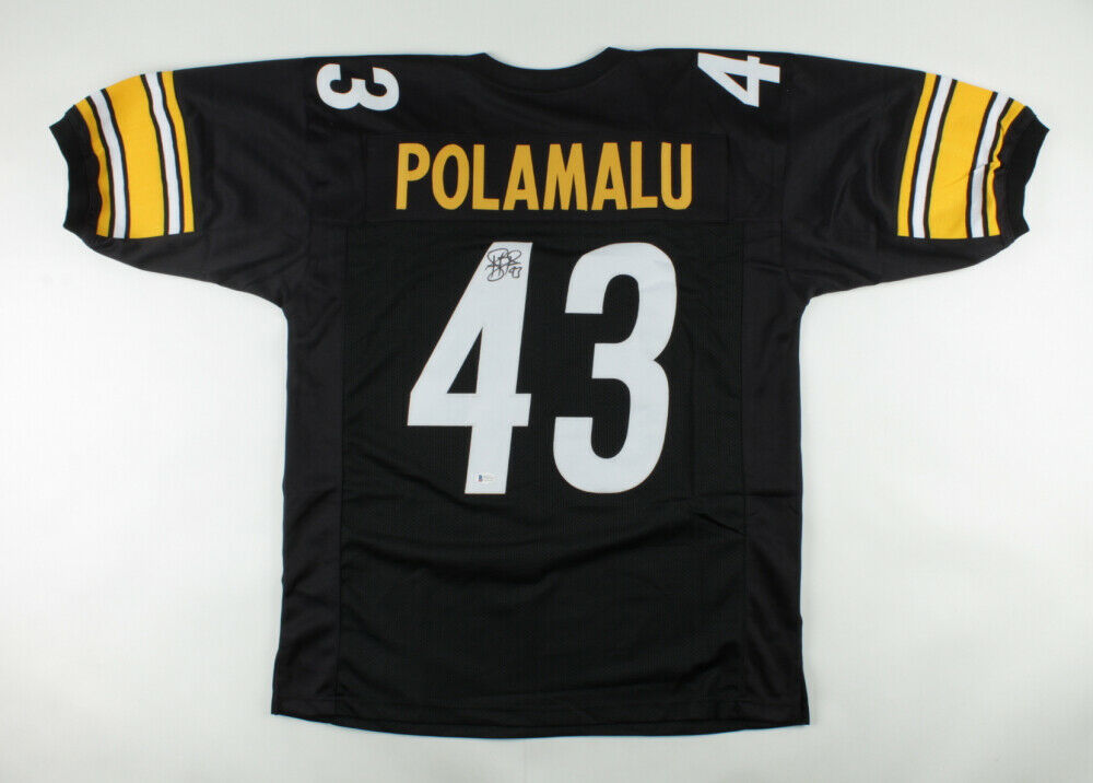 Custom on-field style jersey. Everything sewn on, size XL. Hand-signed by Troy Polamalu.The lot / autograph(s) includes an official Beckett Authentication Services serially-numbered hologram and matching COA for authenticity purposes. The signing of this item was witnessed by Beckett.Authentication: Beckett COA