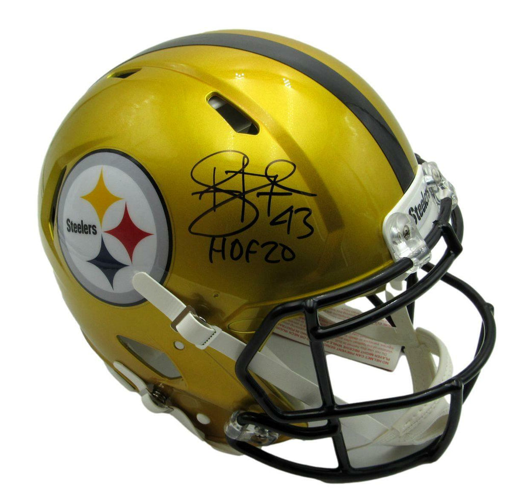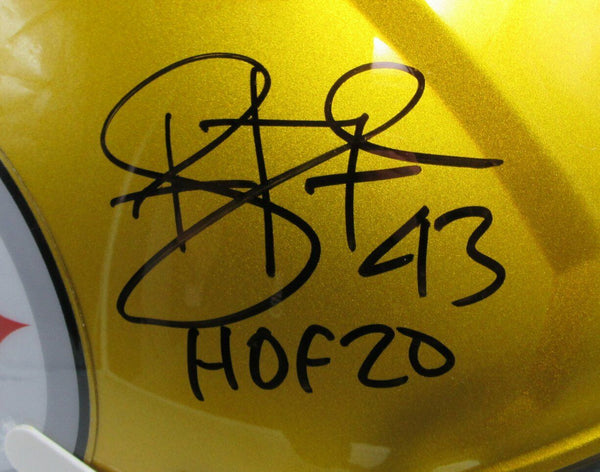 Troy Polamalu Signed/Inscribed "HOF 20" Pittsburgh Steelers Gold Full Size Blaze Replica Football Helmet. This helmet is authenticated by BAS/Beckett and includes their Tamper-proof Hologram Sticker.