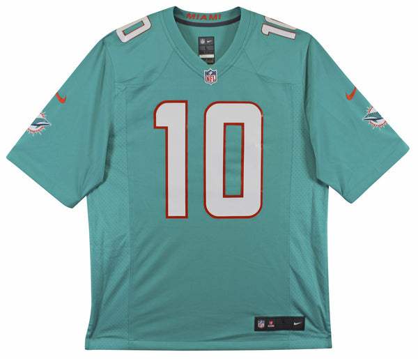 This Autographed Teal Nike Game Jersey has been Personally Signed by Tyreek Hill of the Miami Dolphins. This item is 100% Authentic to include a hologram by Beckett Authentication Services. This item will come with an affixed Beckett Authentication Services (BAS) authentication sticker, which includes a scannable QR code to verify authenticity. Please note that Beckett no longer provides serial-numbered COA cards, and the attached BAS sticker will serve as the complete authentication for this item. This is a BAS Witnessed Protection Program item which means a Beckett Authentication Service representative was present when this item was being signed. We conducted an autograph signing with Tyreek Hill where multiples of the same item were signed. While the photographs are representative of this item, the size, placement and strength of the signature may vary. Each item is hand signed, therefore, each autograph is unique. This item can be verified through BAS Witnessed. This is a Large sized Jersey.