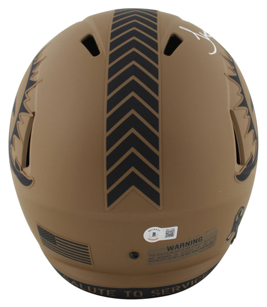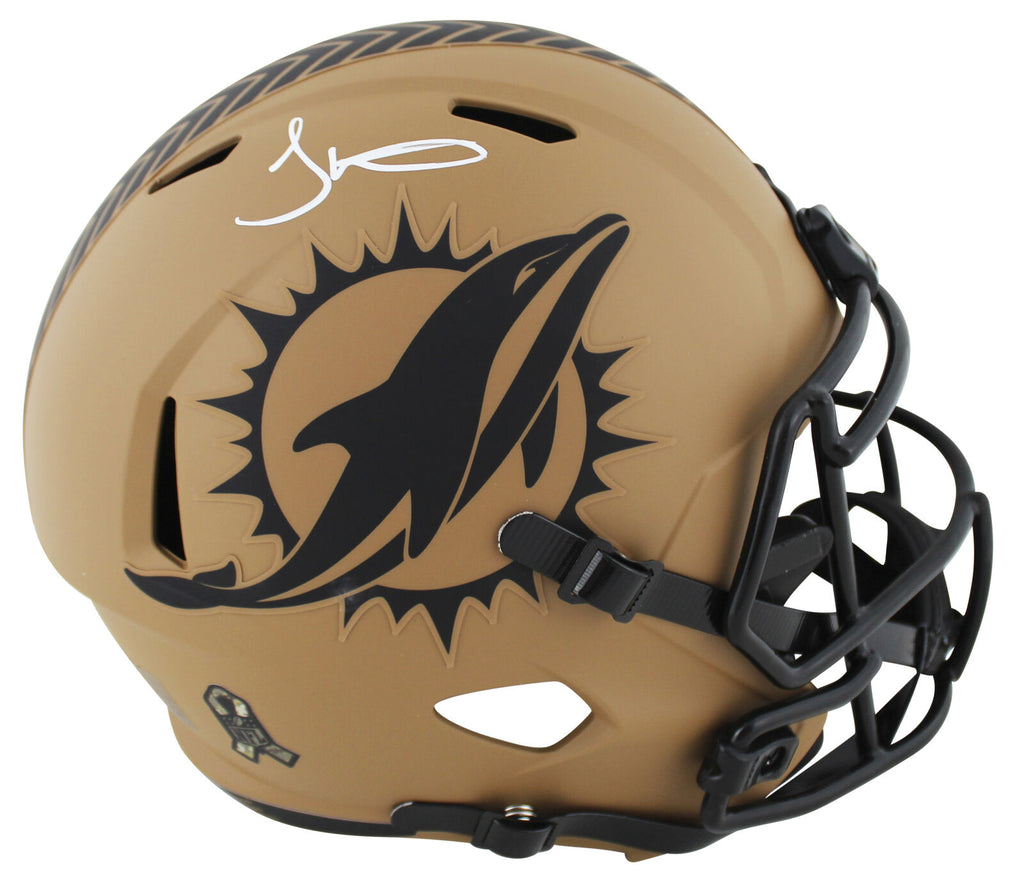 This Autographed Alternate 2023 Salute To Service II Riddell Full Size Speed Rep Helmet has been Personally Signed by Tyreek Hill of the Miami Dolphins. This item is 100% Authentic to include a hologram by Beckett Authentication Services. This item will come with the new Beckett Authentication hologram that has a scannable QR code rather than the traditional COA. If you would like to have a COA, you are welcome to reach out to Beckett for a printed certification once you receive your item. This is a BAS Witnessed Protection Program item which means a Beckett Authentication Service representative was present when this item was being signed. We conducted an autograph signing with Tyreek Hill where multiples of the same item were signed. While the photographs are representative of this item, the size, placement and strength of the signature may vary. Each item is hand signed, therefore, each autograph is unique. This item can be verified through BAS Witnessed.