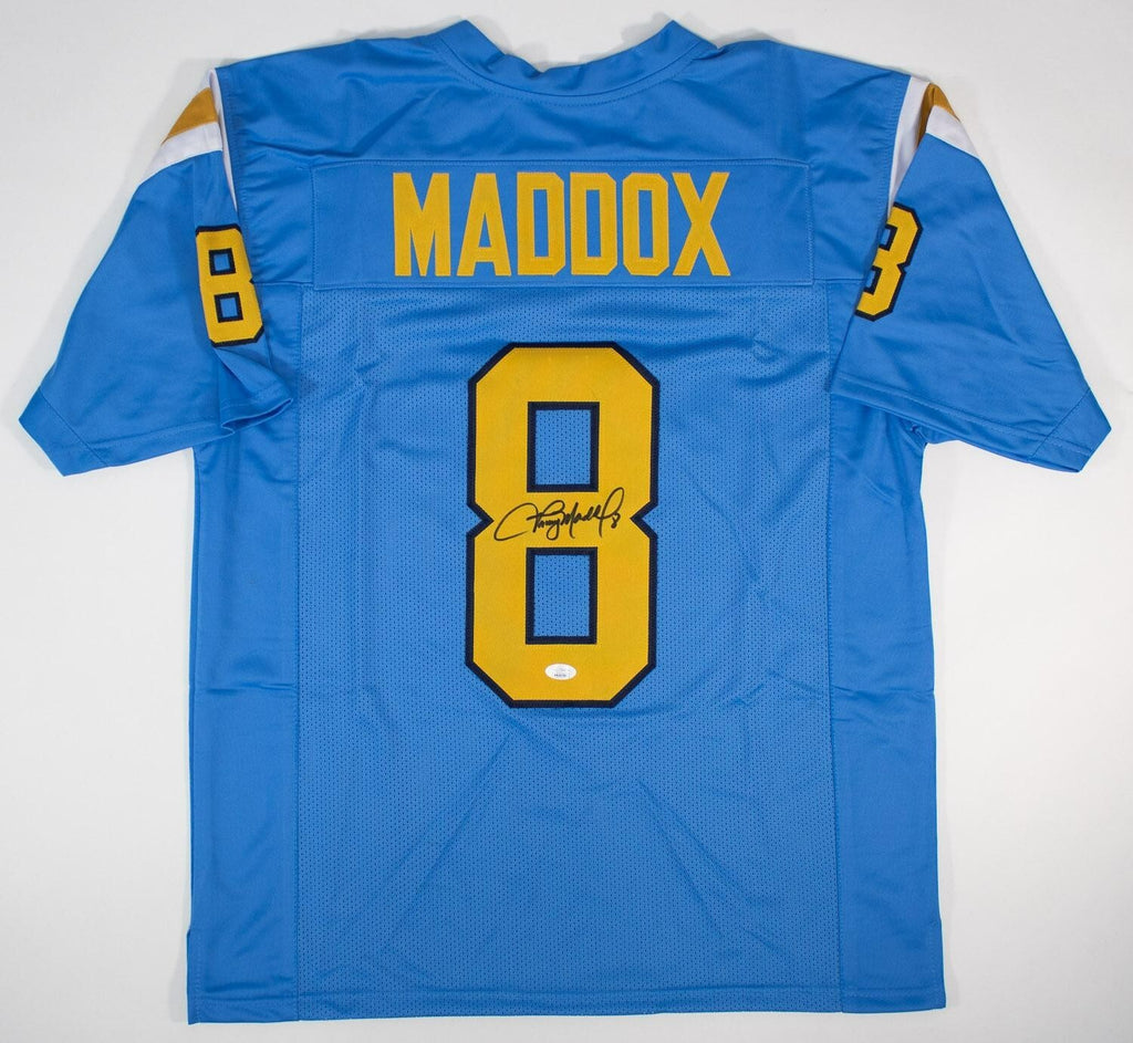 Custom on-field style jersey. Everything is sewn on, size XL. This autographed jersey has been personally hand-signed by Tommy Maddox of the UCLA Bruins.This autograph is certified by James Spence Authentication's (JSA) Witnessed Protection Program. That means that a JSA representative was present when this item was signed. It comes with the numbered hologram and matching Certificate of Authenticity.Custom on-field style jerseys are a more affordable option for autograph seekers. These jerseys do not have any brand name or tags and are made in the Philippines. They feature stitched on names and numbers and are made to look very similar to the on-field jerseys that the players wear. These custom jerseys are very commonly used in the memorabilia industry.