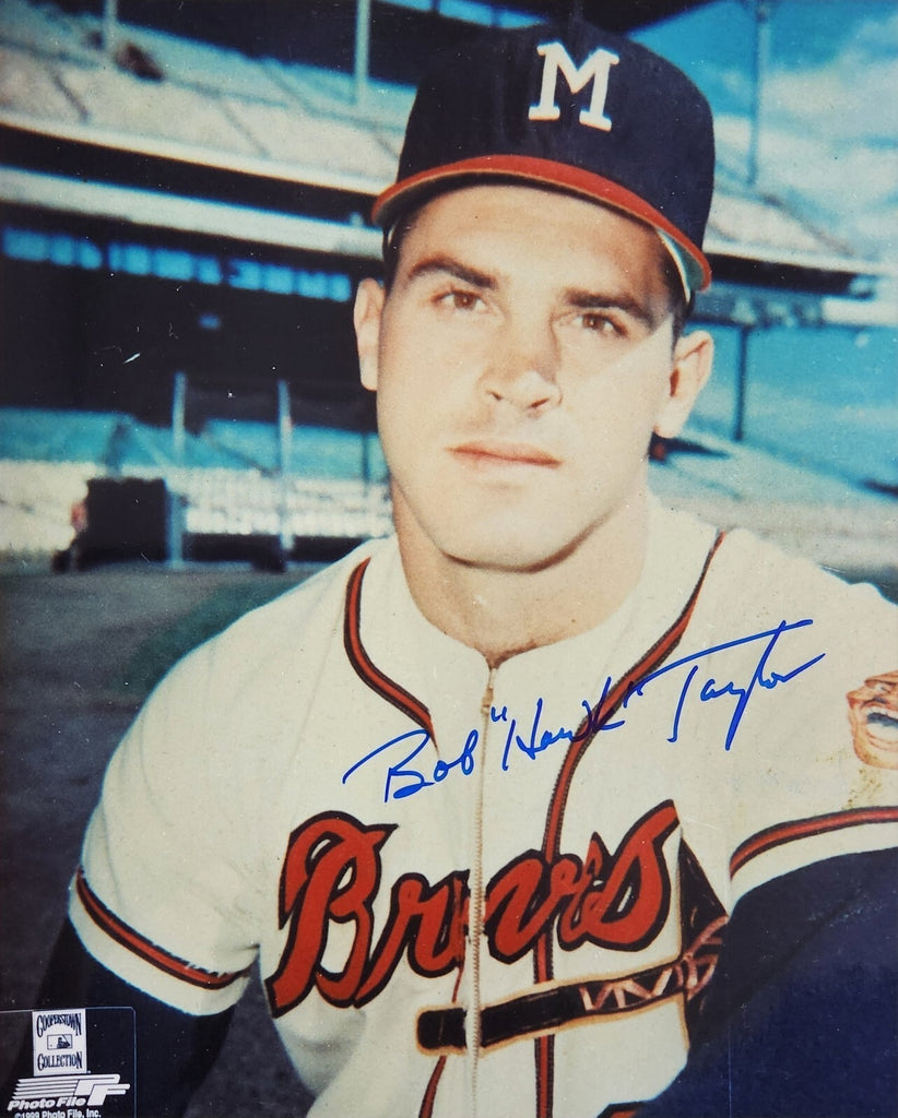 An 8x10 hand signed photo of former MILWAUKEE BRAVE BOB "HAWK" TAYLOR. The signature is in blue sharpie. TAYLOR was a member of the 1957 Milwaukee Braves World Series championship team.. This photo was signed at a private signing in 2010. This would make a great addition to any Taylor or Braves collection! This item was signed at a private signing, is guaranteed to be 100% authentic and will include a COA.