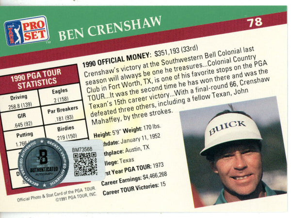The number in the listing title is just an inventory sku for our records and is not the authentication number. This is the exact item that you will receive so please see pictures for condition. This is a trading card that was personally autographed by Ben Crenshaw. Includes a certificate of authenticity from Beckett Authentication Services (BAS) and Denver Autographs.