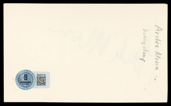 This Autographed 3x5 Index Card has been Personally Signed by Archie Moore of the Boxing. This item is 100% Authentic to include a hologram by Beckett Authentication Services. This item will come with an affixed Beckett Authentication Services (BAS) authentication sticker, which includes a scannable QR code to verify authenticity. Please note that Beckett no longer provides serial-numbered COA cards, and the attached BAS sticker will serve as the complete authentication for this item. The authenticity can be verified on Beckett Authentication Services website.