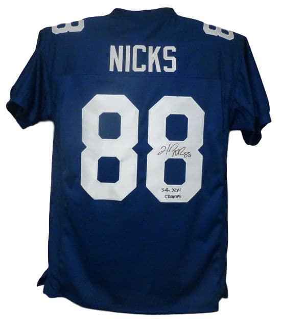 Hakeem Nicks Signed New York Giants Blue XL Jersey SB XLVI Champs 12579 This is a New York Giants custom made jersey, with sewn on name and numbers, that was personally autographed by New York Giants receiver Hakeem Nicks and as you can see he added "SB XLVI Champs". Drafted in the first round of the 2009 draft from North Carolina where he holds the season touchdown reception record with 12. He emerged as a starter during his rookie season and should hold that position for years to come, recorded his first 1000+ yard season in 2010. The was signed at the Mounted Memories sports card show appearance in Rosemont, IL on March 17, 2012 and includes a picture from the signing as well as a certificate of authenticity from Denver Autographs.