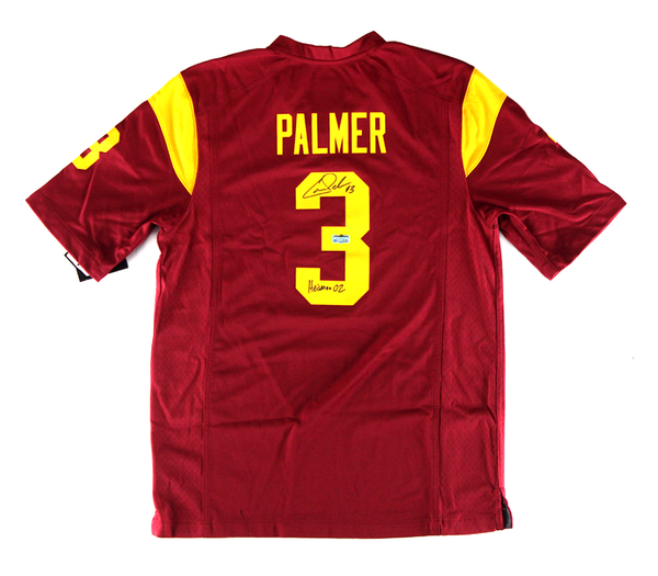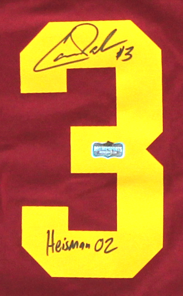 A USC Trojans Maroon Nike Jersey hand signed by Carson Palmer. The item and signature are in excellent condition. In addition to signing his name, Carson inscribed "Heisman 02" on the item. AUTHENTICATION: The item features a Certificate of Authenticity, Serial Numbered and Databased Hologram - Picture of Carson from the signing