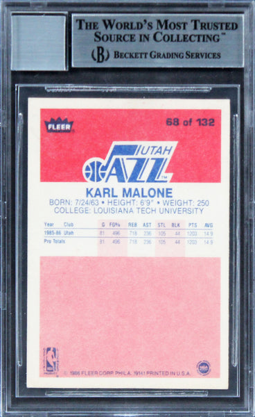 This Autographed Auto Graded Gem Mint 10! (Creased) 1986 Fleer #68 Rookie Card has been Personally Signed by Karl Malone of the Utah Jazz. This item is 100% Authentic, it comes slabbed and authenticated by Beckett Authentication Services. The authenticity can be verified on Beckett Authentication Services website.