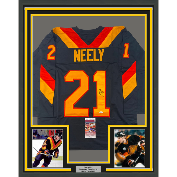 Framed Autographed/Signed Cam Neely 33x42 Vancouver Black Hockey Jersey JSA COA The item is professionally framed & matted with two 8x10 photos, measures 33"x42" and is ready to be hung in your man cave! NOTE: COA card will be mounted on the back of the frame, not inside it on top of the jersey as seen in the picture.
