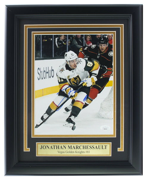 Featured is a Jonathan Marchessault signed framed 8x10 Vegas Golden Knights photo. This photo was hand signed by Jonathan Marchessault and has been authenticated by JSA authentication services. Included with the photo is a JSA hologram and certificate of authentication. Brand new professional framing featuring double matting and an engraved nameplate. The frame measures approximately 11x14 in total size and it is ready for display. This photo would make a great addition to any sports memorabilia collection.. SPECIFICATIONS Autographed By: Jonathan Marchessault Team: Vegas Golden Knights Sport: Hockey Authentication: Professional Sports Authenticator (PSA)