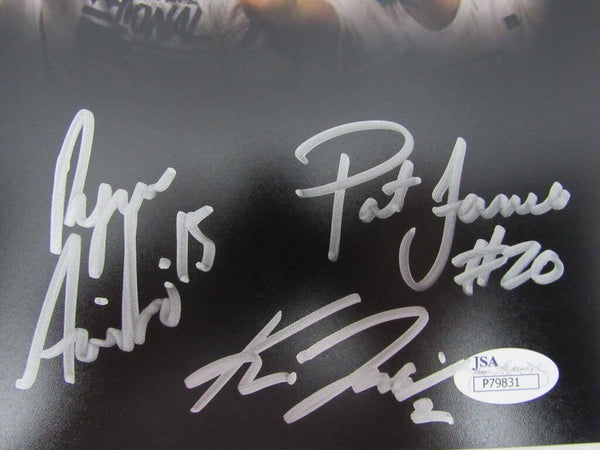 Featured is an 2016 Villanova National Championship Basketball 11x14 photo. Photo includes signatures of Ryan Arcidianco, Dan Ochefu, Kris Jenkins, Pat James, Henry Lowe, Kevin Rafferty, and Darryl Reynolds.. The picture was hand signed in silver sharpie by all seven players. The photo is authenticated by JSA and comes with a tamper proof hologram and certificate of authenticity.