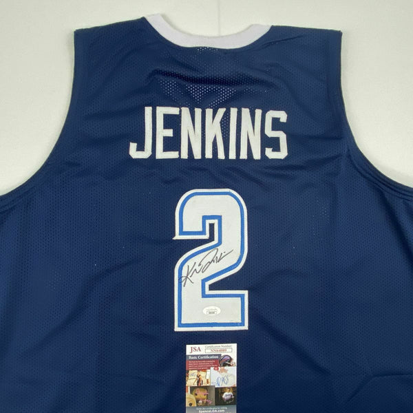 Autographed/Signed KRIS JENKINS Villanova Blue College Basketball Jersey JSA COA This is a custom jersey and was not manufactured by or in any manner associated with any professional sports league or manufacturer. This custom jersey carries no professional sports league designation. The item is intended to be an autographed collectible. Reference of team in the title is to allow the purchaser a point of association. The custom jersey displays the name, number and authenticated signature of the player. This item in no way is affiliated with or connected to any professional sports organization. The autograph, as always is guaranteed to be authentic and has been certified as authentic by a third-party, trusted authenticator. Size is XL unless otherwise noted.