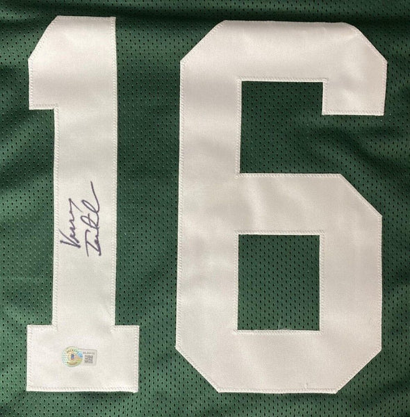 Custom on-field style jersey. Everything is sewn on, size XL. Hand signed in black felt-tip pen by Vinny Testaverde. The autograph includes an official Beckett Authentication Services serially numbered hologram for authenticity purposes. The signing of this item was witnessed by Beckett.Authentication: Beckett Hologram
