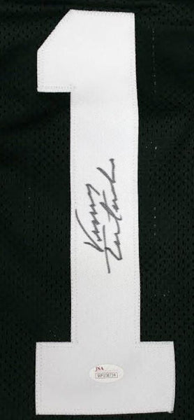 Custom on-field style jersey. Everything is sewn on, size XL. Hand signed in black felt-tip pen by Vinny Testaverde. The autograph includes an official James Spence Authentication (JSA) hologram and matching COA for authenticity purposes.Authentication: JSA COA