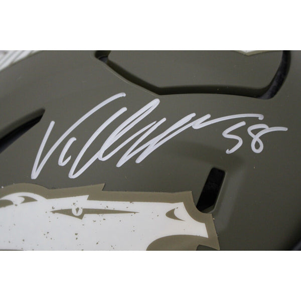 The number in the listing title is just an inventory sku for our records and is not the authentication number. The item pictured is a stock photo unless otherwise noted. This is a Denver Broncos 2022 Salute to Service SpeedFlex Full Size Helmet that was personally autographed by Von Miller. Includes a certificate of authenticity from Beckett Authentication Services (BAS) and Denver Autographs.