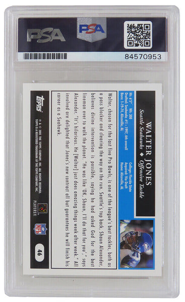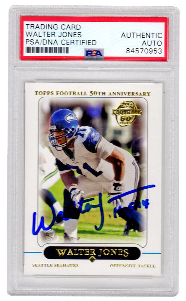 Walter Jones signed Seattle Seahawks 2005 Topps football trading card #46 with 'HOF 14' inscription. The card has been authenticated and encapsulated by PSA/DNA and the number can be verified online. The image of the item is a stock photo, as we may have multiples of the item in stock. The Slabbed Card you will receive will be of the card described. (Same grade, Same authentication) You may or may not receive the exact PSA serial number on the slab label shown in image.