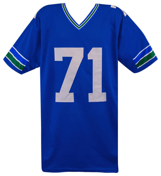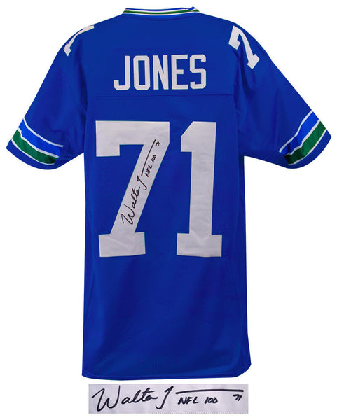 Walter Jones signed blue throwback custom football jersey 'NFL 100' inscription. Item comes with a Schwartz Sports Memorabilia tamper-proof numbered hologram and Certificate of Authenticity which can be verified online. Jersey is size XL.