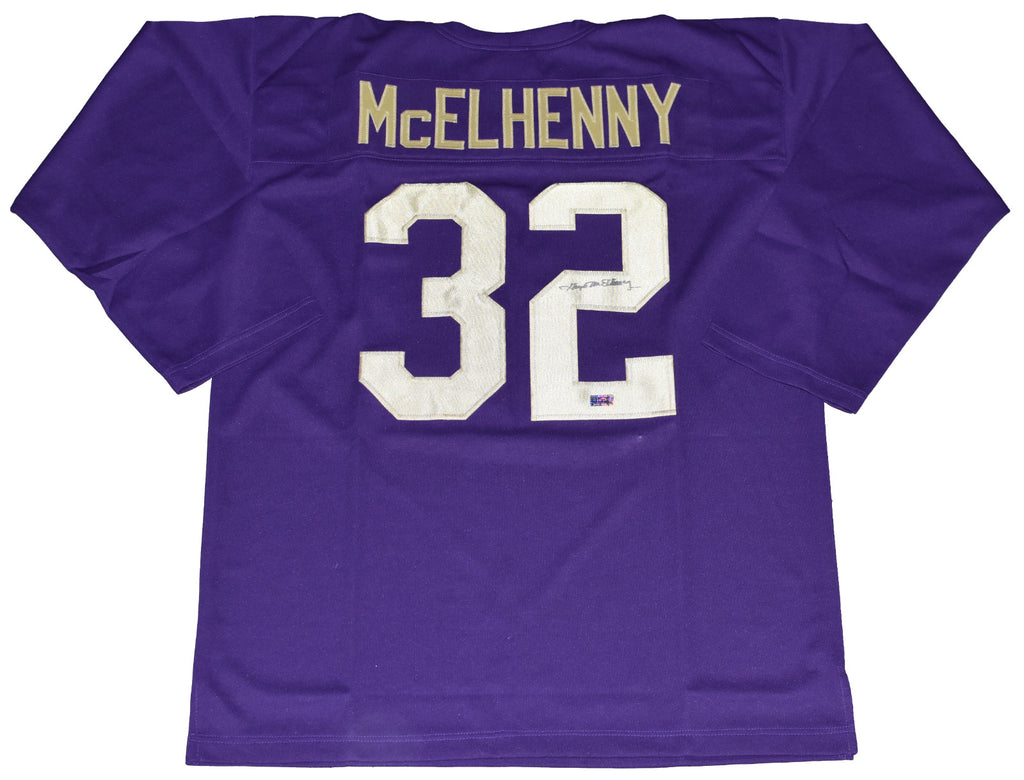 Hugh McElhenny, former All-American running back for the Washington Huskies, has hand signed this purple throwback jersey at a private signing. Jersey is size XL and all letters/numbers are sewn-on. This item comes with a certificate of authenticity (COA) from Signature Sports Marketing, one of the leaders in the industry. You will receive a paper COA along with matching serial-numbered holograms.Item pictured may not be the exact item you will receive. It will be similar quality, and we guarantee your satisfaction.