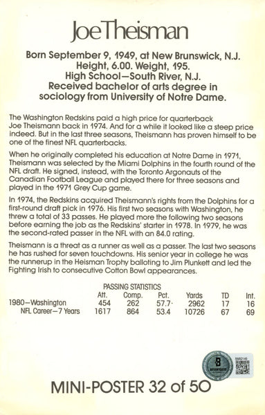 The number in the listing title is just an inventory sku for our records and is not the authentication number. This is a stock photo of the item that you will receive. This is a mini poster measuring 8.5" x 5.5" that was personally autographed by Joe Theismann. Includes a certificate of authenticity from Beckett Authentication Services (BAS) and Denver Autographs.FREE SHIPPING within the USA on orders over $10!