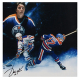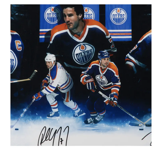 When one reminisces on the Stanley Cup Championships the Oilers won in the 1980s, one cannot help but remember the trio of Wayne Gretzky, Paul Coffey and Jari Kurri. This UDA designed image is printed on photo paper and is an officially NHL licensed product. All three athletes signatures were witnessed by a UDA representative. The 36"x18" collage features various home and away action shots of Gretzky, Coffey and Kurri from their playing days and features the actual banners of their retired numbers in the background. These Stanley Cup champions and Hockey Hall of Fame members have inked their signatures in black paint pen. Their signatures are deemed authentic by virtue of Upper Deck Authenticated's Five-Step Process.You will receive a random number from this edition.