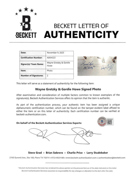 This Autographed 16x20 Photo with the inscription of "Mr. Hockey (Howe)" has been Personally Signed by Wayne Gretzky & Gordie Howe. This item is 100% Authentic to include a Certificate of Authenticity (COA) / hologram by Beckett Authentication Services. The authenticity can be verified on Beckett Authentication Services website.