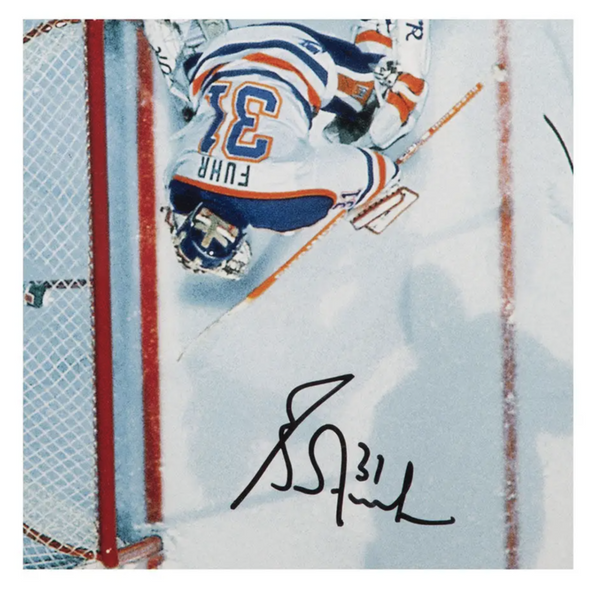 Here is your chance to own a unique piece of hockey history with the autographs of two legends of the game, Wayne Gretzky and Grant Fuhr. Fuhr and Gretzky were teammates in Edmonton and together they won five Stanley Cup championships. In the early 1990s, the Oilers began to dismantle the team and Gretzky was traded to the Los Angeles Kings. Fuhr and Gretzky went from playing on the same winning team for years to facing each other on separate teams. This 16" x 20" action photo features Gretzky on the Kings skating behind the net of Grant Fuhr as he covers his net. Fuhr and Gretzky have both inked their signatures in black paint pen. This autographed image by Fuhr and Gretzky is limited to 75. Their signatures are deemed authentic by virtue of Upper Deck Authenticated's Five Step Process.You will receive a random number from this edition.