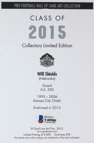 Will Shields Autographed Steelers Goal Line Art Card w/ HOF- Beckett *Blue This is a Will Shields of the Kansas City Chiefs hand autographed goal line art card inscribed with HOF. This item has a Beckett Authentication, which comes with a Beckett numbered sticker and a matching Certificate of Authenticity. You can view this item on the Beckett Authentication website. It was signed either at a public autograph appearance or a private signing. This is a stock photo of the item. Although you may not receive this exact item, the item you receive is virtually identical, brand new, and in great shape.
