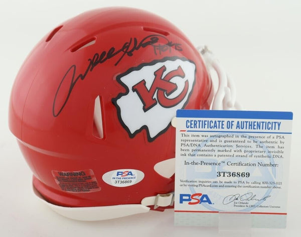 Riddell Kansas City Chiefs Speed mini helmet. Hand-signed and inscribed by Will Shields (HOF).The autograph(s) includes an official PSA/DNA hologram and matching COA for authenticity purposes. The signing of this item was witnessed by PSA.Authentication: PSA COA