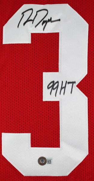 This Autographed Red Pro Style Jersey with the inscription of "99 HT" has been Personally Signed by Ron Dayne of the Wisconsin Badgers. This item is 100% Authentic to include a hologram by Beckett Authentication Services. This item will come with an affixed Beckett Authentication Services (BAS) authentication sticker, which includes a scannable QR code to verify authenticity. Please note that Beckett no longer provides serial-numbered COA cards, and the attached BAS sticker will serve as the complete authentication for this item. This is a BAS Witnessed Protection Program item which means a Beckett Authentication Service representative was present when this item was being signed. We conducted an autograph signing with Ron Dayne where multiples of the same item were signed. While the photographs are representative of this item, the size, placement and strength of the signature may vary. Each item is hand signed, therefore, each autograph is unique. This item can be verified through BAS Witnessed. This is a X-Large sized, non-branded, custom-stitched Jersey.