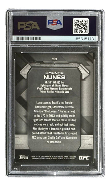 Featured is a Amanda Nunes signed 2014 Topps #93 trading card. This card has been hand signed by Nunes and has been authenticated and encapsulated by PSA. This card would make a great addition to any sports memorabilia collection. SPECIFICATIONS Autographed By: Amanda Nunes Team: Sport: Mixed Martial Arts (MMA) Authentication: Professional Sports Authenticator (PSA)