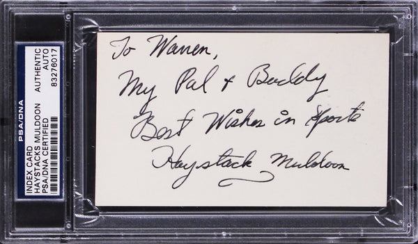 This Autographed 3x5 Index Card with the inscription of "To Warren, My Pal & Buddy Best Wishes In Sports" has been Personally Signed by Haystacks Muldoon. This item is 100% Authentic, it comes slabbed and authenticated by PSA/DNA. The authenticity can be verified on Professional Sports Authenticator website.