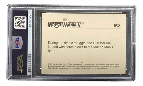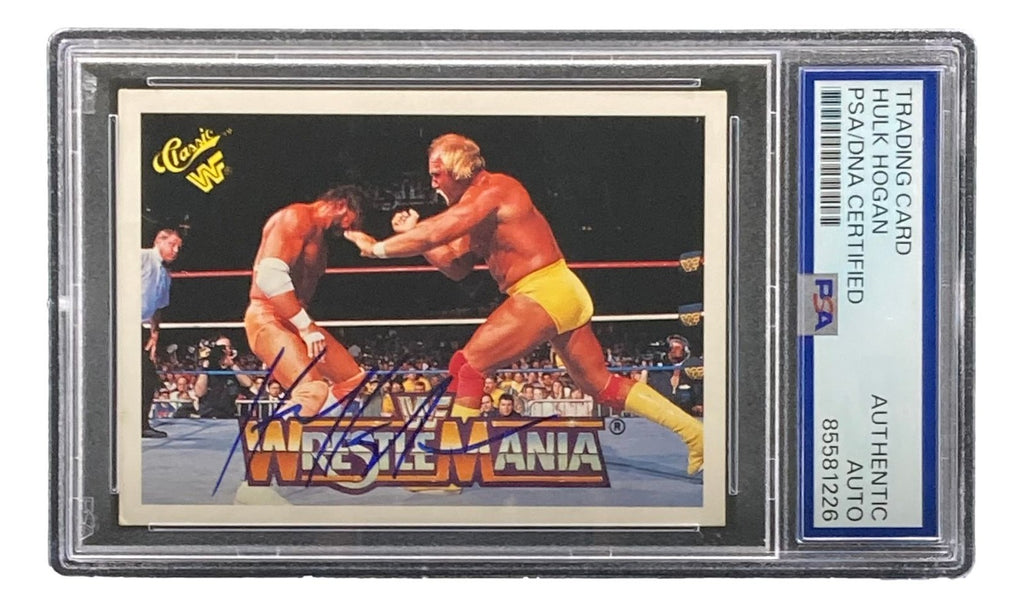 Featured is a Hulk Hogan signed 1990 Classic WWF #95 trading card. This card has been hand signed by Hogan and has been authenticated and encapsulated by PSA. This card would make a great addition to any sports memorabilia collection! SPECIFICATIONS Autographed By: Hulk Hogan Team: Sport: Wrestling Authentication: Professional Sports Authenticator (PSA)