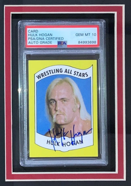Featured is a Hulk Hogan signed reprint 1982 Wrestling All Stars #4 rookie card. This card has been encapsulated and authenticated by PSA, receiving a Gem MT 10 autograph grade. This card has been professionally framed and matted and is approximately 20x23. This card would make a great addition to any sports memorabilia collection!.. SPECIFICATIONS Autographed By: Hulk Hogan Team: Sport: Wrestling Authentication: Professional Sports Authenticator (PSA)