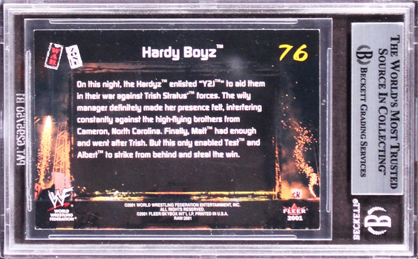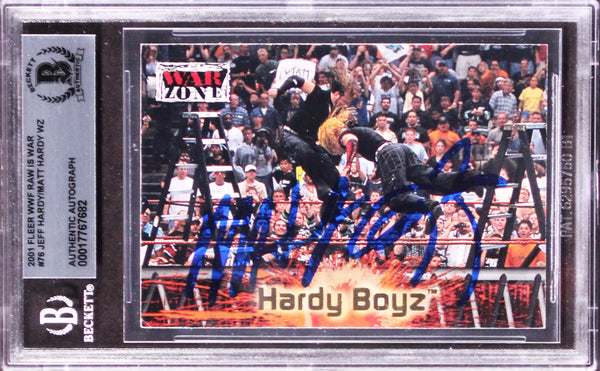 This Autographed 2001 Fleer WWF Raw is War Raw #76 Card has been Personally Signed by Jeff Hardy & Matt Hardy. This item is 100% Authentic, it comes slabbed and authenticated by Beckett Authentication Services. The authenticity can be verified on Beckett Authentication Services website.