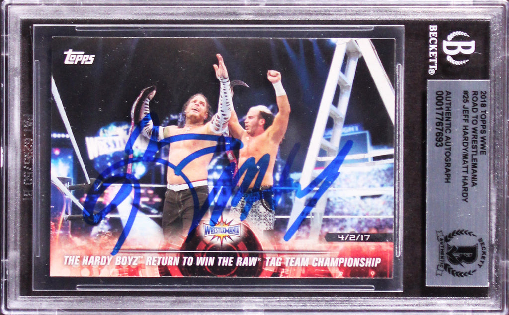 This Autographed 2018 Topps WWE Road To Wrestlemania Card has been Personally Signed by Jeff Hardy & Matt Hardy . This item is 100% Authentic, it comes slabbed and authenticated by Beckett Authentication Services. The authenticity can be verified on Beckett Authentication Services website.