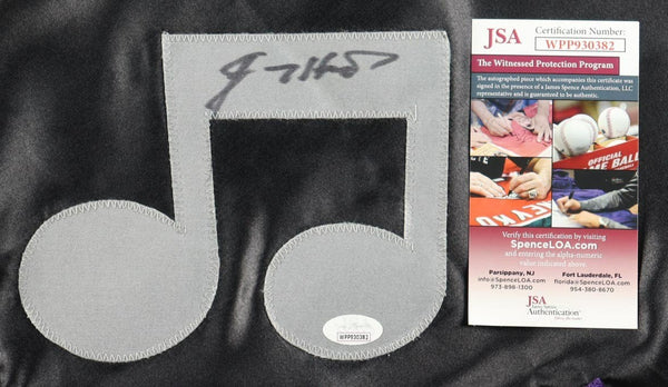 Custom black music note shirt. Everything sewn on, size XL. Hand-signed by Jimmy Hart (HOF).James Ray Hart (born January 1, 1943) is an American professional wrestling manager executive, composer, and musician currently signed with WWE in a Legends deal. He is best known for his work in the World Wrestling Federation (WWF) and World Championship Wrestling (WCW), where he used the nickname "The Mouth of the South".The autograph includes an official James Spence Authentication (JSA) hologram and matching COA for authenticity purposes. The signing of this item was witnessed by JSA.Authentication: JSA COA