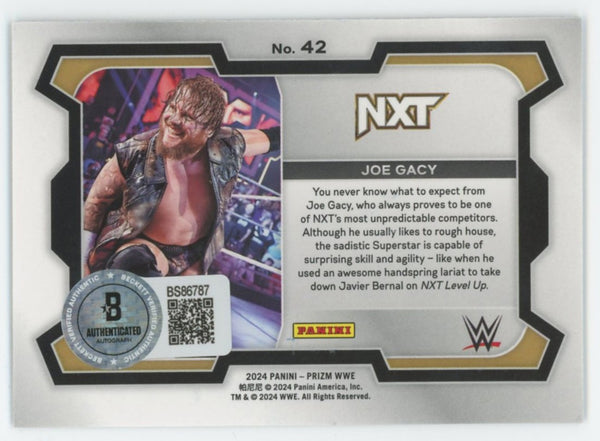 This Autographed 2024 Panini Prizm #42 Card has been Personally Signed by Joe Gacy of the World Wrestling Entertainment. This item is 100% Authentic to include a hologram by Beckett Authentication Services. This item will come with an affixed Beckett Authentication Services (BAS) authentication sticker, which includes a scannable QR code to verify authenticity. Please note that Beckett no longer provides serial-numbered COA cards, and the attached BAS sticker will serve as the complete authentication for this item. The authenticity can be verified on Beckett Authentication Services website.