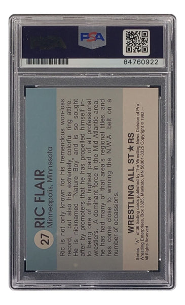 Featured is a Ric Flair signed reprint 1982 Wrestling All Stars card #27, inscribed "16x". This card has been slabbed and authenticated by PSA authentication services giving the autograph a Gem Mint 10 grading. This item would make a great addition to any sports memorabilia collection! SPECIFICATIONS Autographed By: Ric Flair Team: Sport: Wrestling Authentication: Professional Sports Authenticator (PSA)