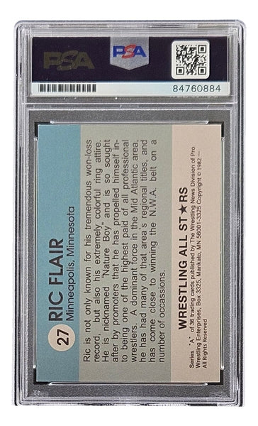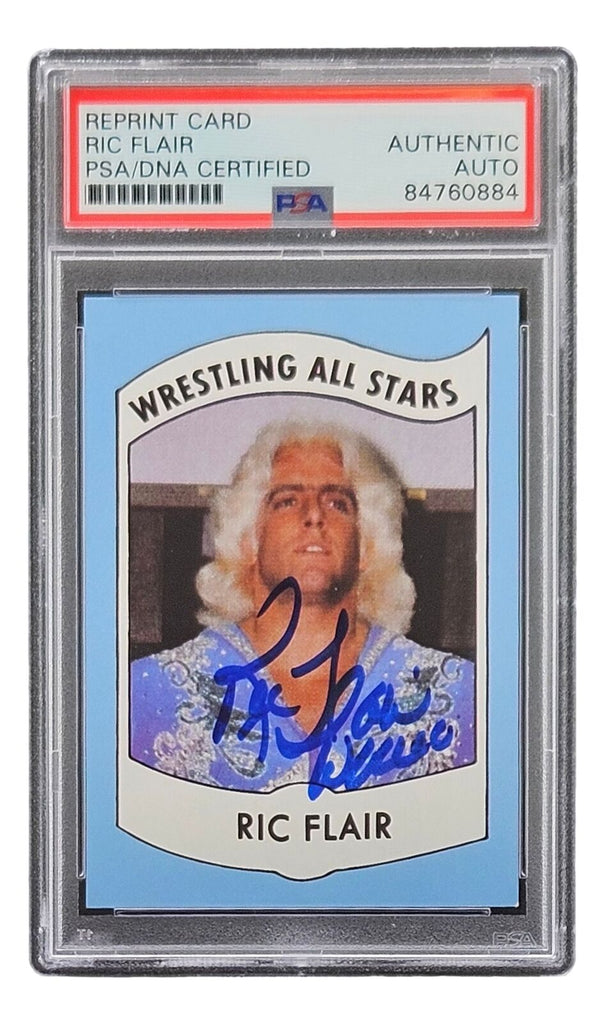 Featured is a Ric Flair signed reprint 1982 Wrestling All Stars card #27, inscribed "Wooooo". This card has been slabbed and authenticated by PSA authentication services giving the autograph an Authentic Auto grading. This item would make a great addition to any sports memorabilia collection! SPECIFICATIONS Autographed By: Ric Flair Team: Sport: Wrestling Authentication: Professional Sports Authenticator (PSA)