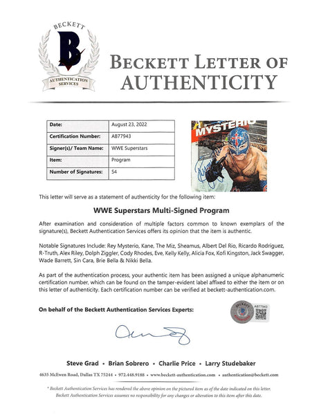This Autographed 9.15x13.25 WWE Official Program has been Personally Signed by Rey Mysterio, Kane, The Miz, Sheamus, Albert Del Rio, Ricardo Rodriguez, R-Truth, Alex Riley, Dolph Ziggler, Cody Rhodes, Eve, Kelly Kelly, Alicia Fox, Kofi Kingston, Jack Swagger, Wade Barrett, Sin Cara, Brie Bella, Nikki Bella, Beth Phoenix, Natalya, Jinder Mahal, Santino Marella, Zack Ryder, John Laurinaitis, Mason Ryan, Yoshi Tatsu, Jimmy Uso, Jey Uso, Rosa Mendes, Kaitlyn, Justin Gabriel, Hornswoggle, JTG, Michael McGillicutty, Tyler Reks, Heath Slater, Johnny Curtis, Tyson Kidd, Curt Hawkins, Aksana, Naomi, Vikie Guerrero, Matt Striker, Michael Cole, Jerry Lawler, Booker T & Scott Stanford. This item is 100% Authentic to include a Certificate of Authenticity (COA) / hologram by Beckett Authentication Services. The authenticity can be verified on Beckett Authentication Services website.